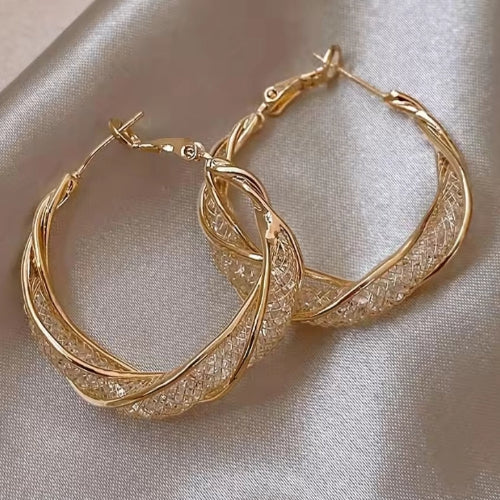 Design Rhinestones Hoop Earrings Vintage Gold Color Hollow Mobius Twisted Round Earrings Women's Jewelry